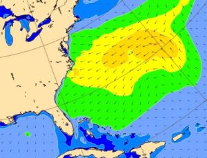 The Nor’easter/Low pressure system is forecast to move up near or just offshore the Mid Atlantic Coast through early next week (again with some chance a secondary circulation will linger further south). This should allow favorable winds/conditions to prevail, along with slowly fading surf. At this point fun sized thigh-waist-chest high surf is expected to continue on Monday, before continuing to slowly drop through the middle of the week. We’ll again need to watch for a trailing secondary low keeping N winds around a little longer, but if that occurs, you’ll want to think of protected/more south facing locations. If the GFS scenario pans out, we’d have a much better chance of NW winds and more widespread, cleaner surf Sun/Mon.