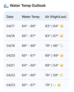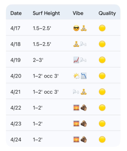 4/22 to 4/24: 1–2′ small surf. Highs Mid to Upper 70s. Bigger boards in the mornings (low tides) likely the call before winds get on it. Quality: 🟡.
