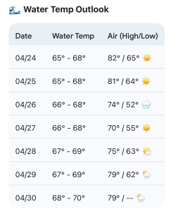 - 4/28: 2–3’+ (thigh-stomach high) ENE mix. High 75°F. Winds gradually improving. Quality: 🟡 / 🟢.