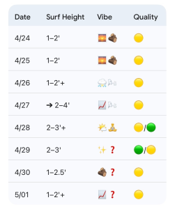 - 4/24 (Friday): 1–2′ (~knee high with only slightly bigger peaks for top spots) in S windswell. High 82°F. Best AM / SSW breezes PM. Quality: 🟡.