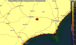 Probability for Low Temperatures to be less than 20F Monday Morning. The beaches have around a 20-40% chance with near 100% chance for lows in the teens inland! This combined with breezy N winds will lead to bitterly cold temperatures Sunday night and Monday.