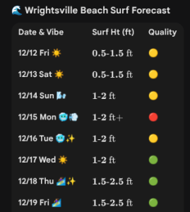 Wrightsville Beach surf forecast December 12-19, 2025. This is face heights, so 1-2′ is shin to knee high. Green color = fair/good conditions, Yellow = Marginal, Red = Poor.