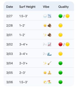 - 2/27 (Friday): 1.5–3′ (Knee to Waist High) SSE swell. High 57°F. Rainy; light winds becoming NE. Clean becoming textured in the PM. Quality: 🟡 / 🔴.