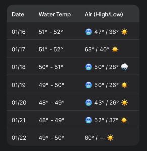 - 1/17: 1–2’ shin to knee high S/SE swell. Late morning/early afternoon lower tide is likely the only option. Moderate SW winds and semi-clean conditions. High 63°F.